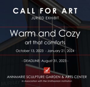 Annmarie Sculpture Garden & Arts Center invites emerging and established artists to submit original artworks to ‘Warm and Cozy: art that comforts.’ The exhibit will feature artwork that captures the sensation of feeling warm, and the physical and emotional responses we have to being warm. One of our most basic human needs, warmth can signify comfort, security, intimacy, and community connection. Depictions of sun-drenched landscapes and intimate cozy interiors, heartfelt portraits and loving embraces, plush soft sculpture and tactile works, warm wearable art, multi-sensory installations, or nostalgic subjects and family traditions are all welcome. The artwork in this show should envelop the viewer and induce a sense of comfort, security, and contentment.